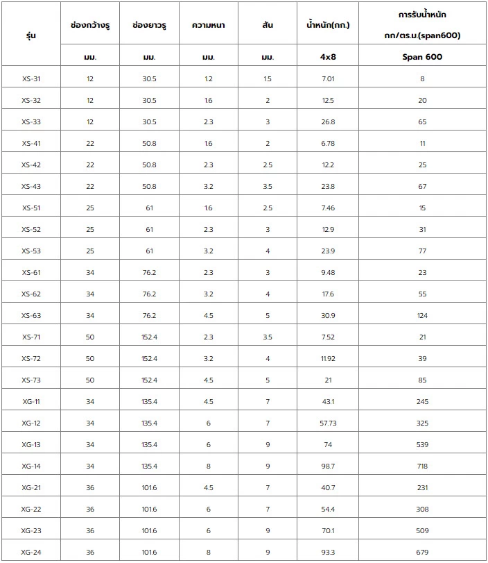 "ตารางขนาดตะแกรงเหล็กฉีกและการรับน้ำหนัก ทุกรุ่นที่ บริษัทเค.โอ.เอช.อินเตอร์เนชั่นแนล จัดจำหน่าย"