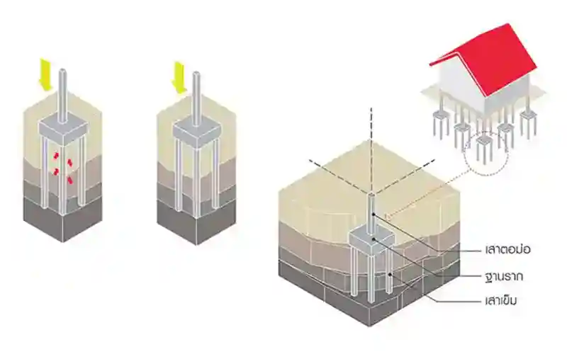 เสาเข็ม เป็นโครงสร้างที่ถูกฝังลึกลงไปในดิน มีหน้าที่ในการรับน้ำหนักจากตัวบ้านและส่งต่อลงไปยังชั้นดินที่มีความแข็งแรง เสาเข็มมีหลายประเภท เช่น เสาเข็มตอก เสาเข็มเจาะ และเสาเข็มแบบสั่น การเลือกใช้เสาเข็มขึ้นอยู่กับลักษณะของดินและน้ำหนักที่ต้องการรองรับ