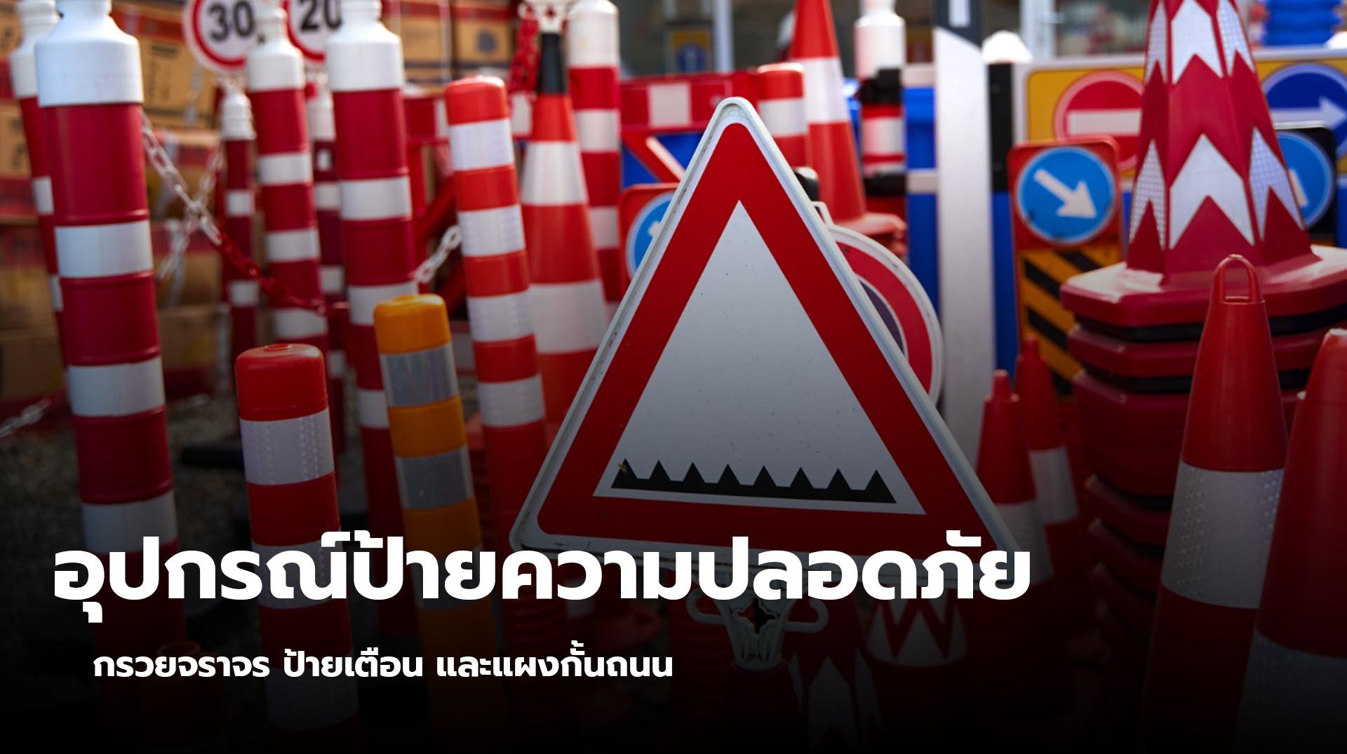 อุปกรณ์ความปลอดภัย เช่น กรวยจราจร ป้ายเตือน และแผงกั้นถนน