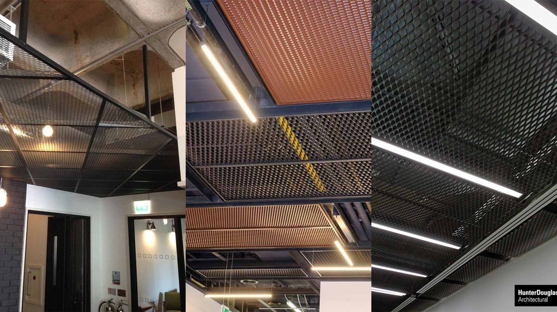 การใช้ ตะแกรงเหล็กฉีกเป็นฝ้าเพดาน ช่วยเพิ่มความทันสมัยและเพิ่มลูกเล่นให้กับพื้นที่ภายในอาคาร สามารถใช้ร่วมกับแสงไฟ LED เพื่อสร้างแสงเงาที่น่าสนใจ เหมาะกับ
