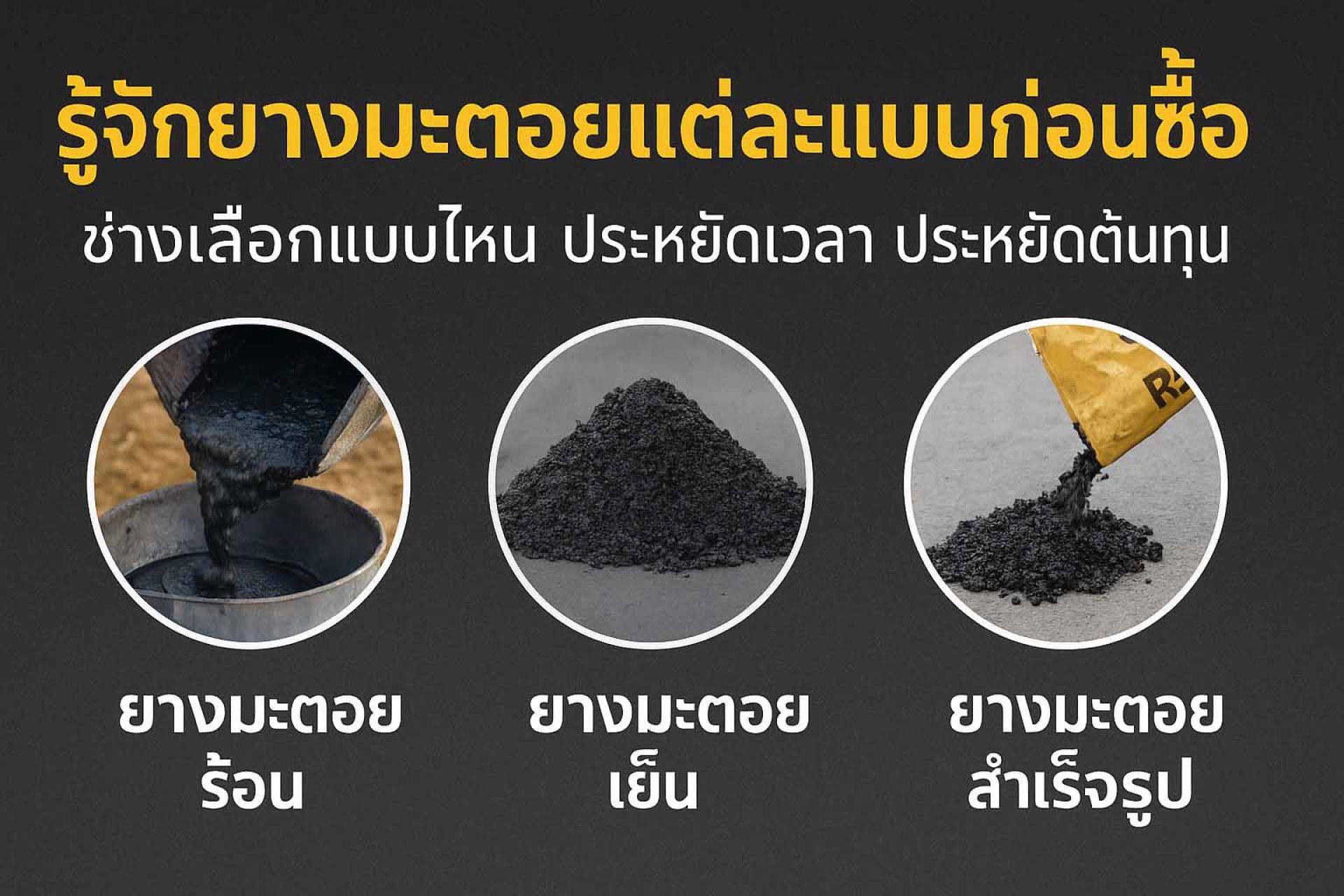 60% ใช้ยางมะตอยสำเร็จรูป, 30% ใช้ยางมะตอยร้อน, 10% ใช้ยางมะตอยเย็น ไม่มีแบบใดดีที่สุด แต่แบบที่เหมาะกับหน้างานคือคำตอบ